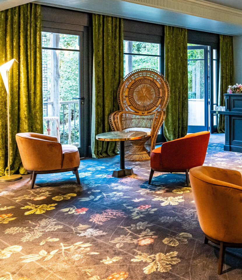Pour l’hôtellerie, le studio élabore un tissu floral créé sur mesure comme “fil conducteur”pour l’ensemble des services, reprenant le motif des moquettes de l’établissement.